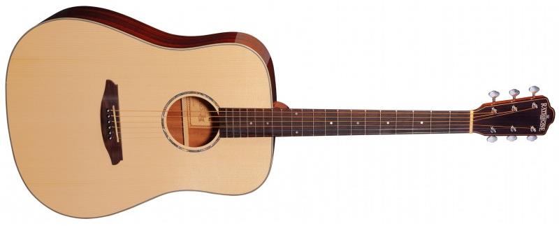 Akustická gitara – 6 strún, telo Dreadnought, 20 pražcov, menzúra 650 mm, šírka nultého pražca 42 mm, polomasívny korpus, lesklá povrchová úprava, predná doska smrek, zadná doska mahagón, luby mahagón, krk mahagón, hmatník palisander Obzeráte sa po novom nástroji? Akustická gitara Rathbone by sa mohla stať tou správnou voľbou. Má vo vienku charakteristický užší krk. Výrobca ju vybavil menzúrou v dĺžke 650 mm a šírkou nultého podva