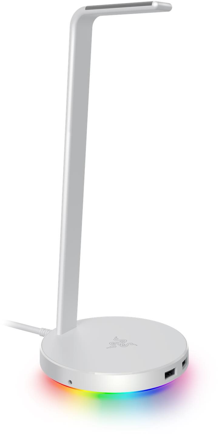 Stojan na slúchadlá – stolný, protišmykové vyhotovenie a RGB podsvietenie, materiál: hliník, biela farba, rozmery 27,4 × 12 × 12 cm (V׊×H) Stojan Razer Base Station V2 Chroma ponúka štýlové uloženie vašich slúchadiel. Tvorený je konštrukciou z vysokokvalitného hliníka a protišmykovou základňou, ktorá pevne drží stojan na stole. Disponuje