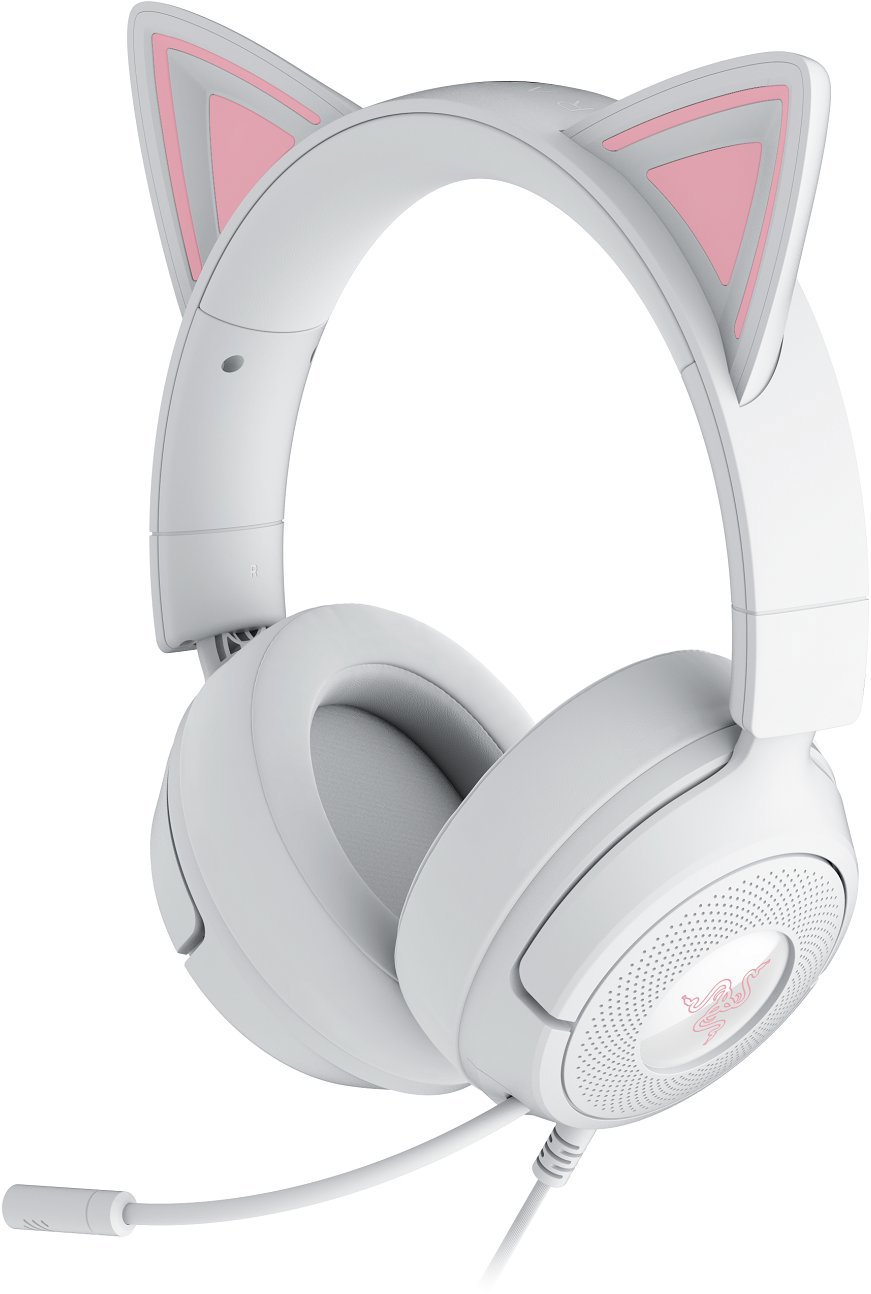 Herné slúchadlá – káblové, s mikrofónom, cez hlavu, na uši, uzatvorená konštrukcia, 3,5 mm Jack, k PC, PlayStation 5 a Nintendo Switch, s ovládaním hlasitosti, frekvenčný rozsah 20 – 28000 Hz, citlivosť 98 dB/mW, impedancia 32 Ohm, menič 40 mm, kábel 1,3 m Uvoľnite svoju vnútornú mačaciu energiu s hernými slúchadlami Razer Kraken Kitty V3 X White – s drôtovým headsetom s ikonickými mačacími ušami, ktorý vám umožní hrať hry, streamovať a počúvať hudbu št
