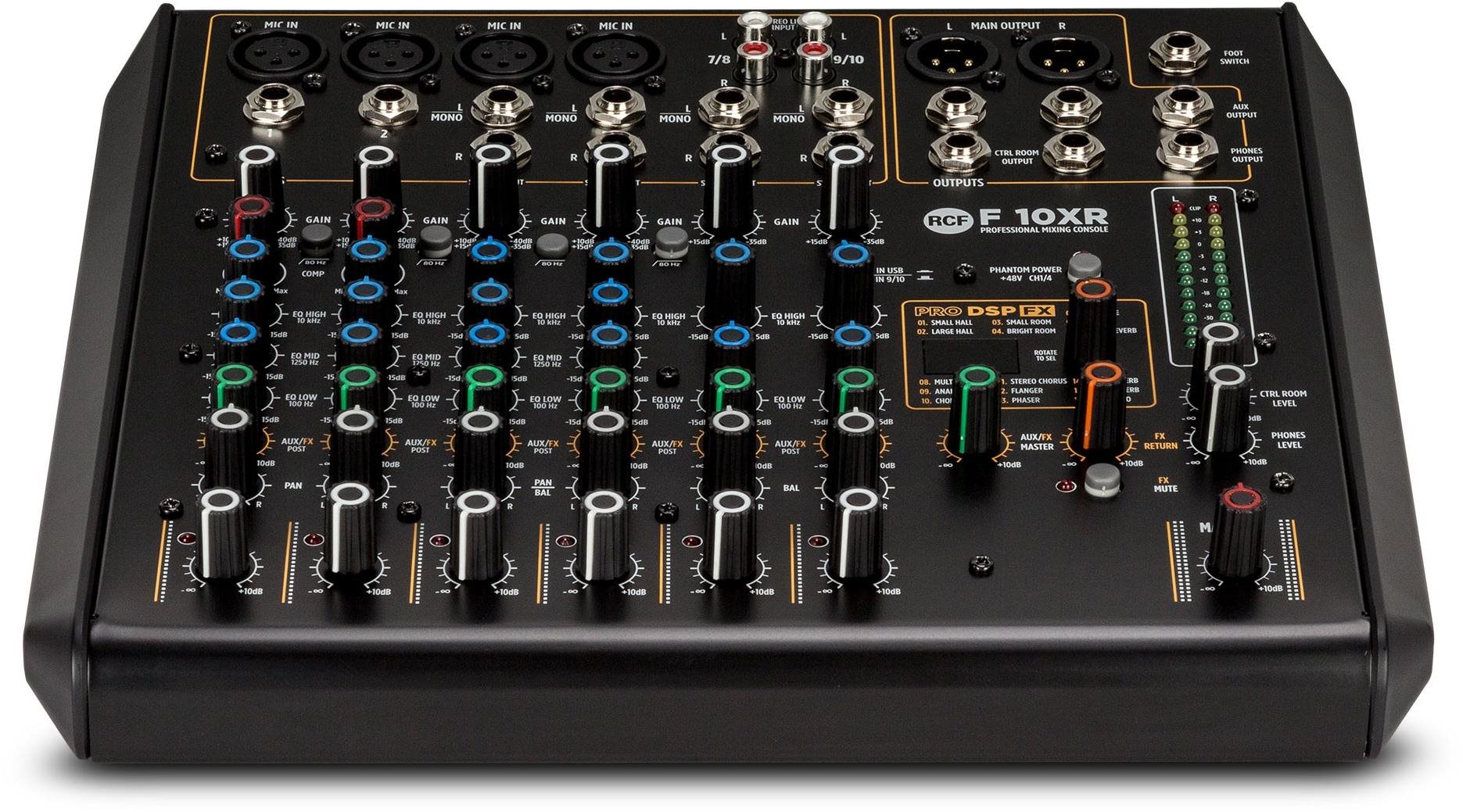 Mixážny pult – analógový s USB výstupom, 10 kanálov, 16 integrovaných efektov, vstupy: 4× XLR, 10× 6,3 mm Jack, 4× RCA, výstupy: 2× XLR, 5× 6,3 mm Jack, 6,3 mm Jack slúchadlový výstup, ekvalizér, integrovaný kompresor, pan/bal, phantomové napájanie +48 V Desaťkanálový mixážny pult RCF F 10XR ponúkne 24-bitovú efektovú jednotku a až 16 efektov na štúdiovej úrovni. Na úpravu a tvarovanie zvukov je k dispozícii na všetkých mikrofónových vstupoch