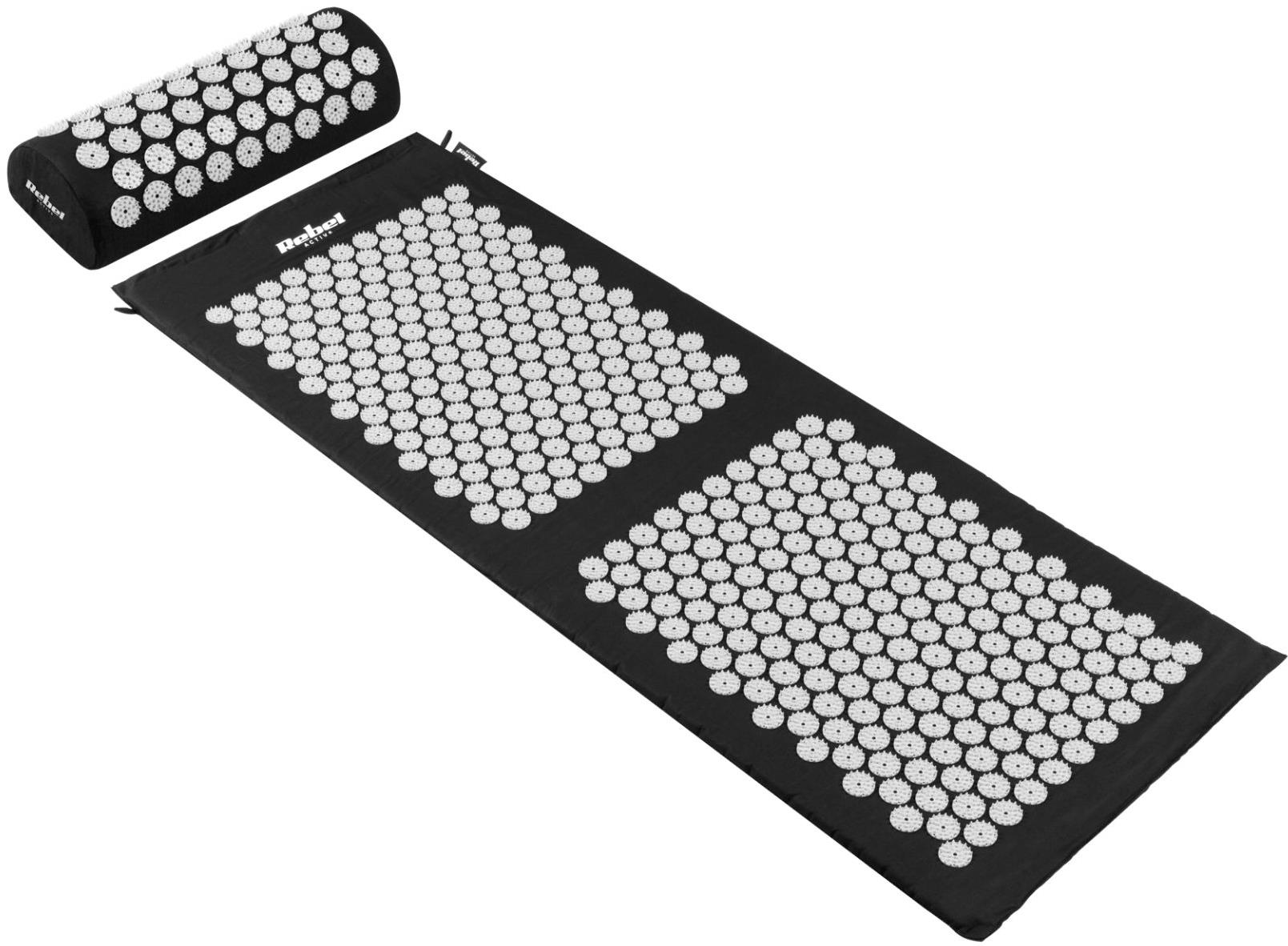 Akupresúrna podložka – s vankúšom, 378 roziet, rozmery podložky 50 × 130 cm (Š×D), hrúbka podložky 2 cm, rozmery vankúša 10 × 14 × 39 cm (V׊×D), obal, prepravná taška súčasťou balenia, maximálna nosnosť 100 kg, materiál bavlna, čierna farba Akupresúrna podložka REBEL RBA-6003-BK s vankúšom predstavuje účinný nástroj na každodennú regeneráciu, relaxáciu a úľavu od bolesti. Vďaka 378 rozetám s 33 hrotmi na podložke a 54 na vankúši aktívne