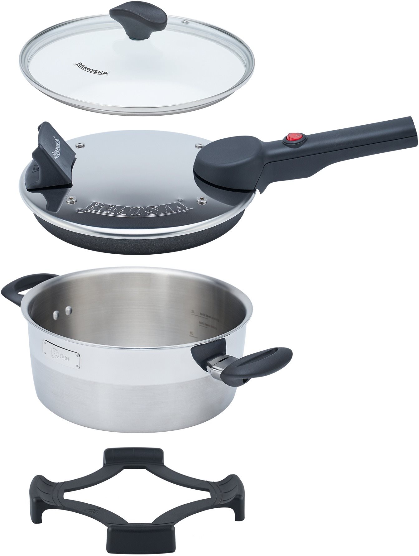 Remoska – objem 2 l, vo výbave príslušenstvo vhodné do umývačky, termostat, regulácia teploty, antikorový vnútorný povrch, príkon 400 W, pokrievka súčasťou balenia, rozmery 47 × 27 × 16,5 cm (Š×D×V), hmotnosť 4,3 kg, strieborná farba Remoska D51/10 2l Dua —Multifunkčný kuchynský pomocník Elektrický hrniec na pečenie Remoska D51/10 2 l Dua vám uľahčí prípravu rozličných typov jedál od polievok cez omáčky, koláče alebo pečené