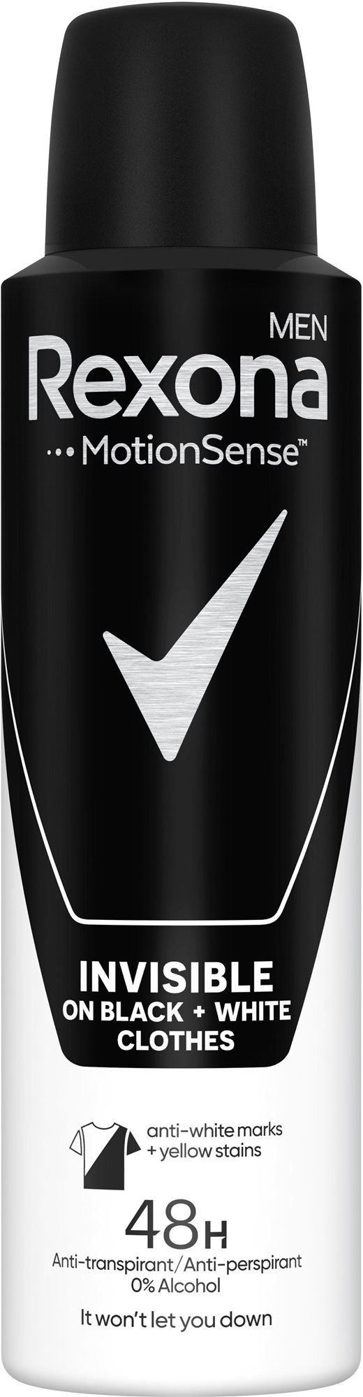 Antiperspirant – pánsky, v spreji, vhodný na mastnú, normálnu, zmiešanú, suchú a zrelú pokožku, svieža vôňa, ochranný a osviežujúci, dlhotrvajúci, na každodenné použitie, nezanecháva škvrny, bez alkoholu, objem 150 ml REXONA Men Invisible Black + White 150 ml je spoľahlivý pánsky antiperspirant v spreji, ktorý poskytuje až 48-hodinovú ochranu proti poteniu a zápachu. Vďaka unikátnemu zloženiu nezanecháva biele stop