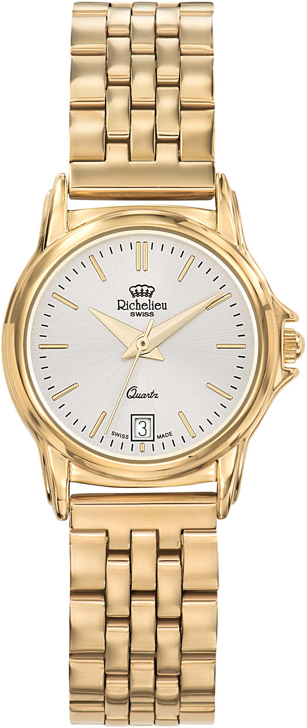 Hodinky dámske – analógové zobrazenie času, strojček quartz, okrúhly ciferník, dátum, elegantné, bez číslovania, minerálne sklíčko, vodotesnosť 30 m (3 ATM), materiál puzdra bezniklová zliatina, zlatá farba puzdra, materiál remienka oceľ, zlatá farba remienka Richelieu 708M.05.911 sú zaujímavé dámske hodinky na ruku, na ktoré je vždy spoľah. Tvorí ich okrúhly ciferník široký 27 mm. Efektívna Quartz technológia je synonymom vysokej spoľahlivosti a dlhej výd