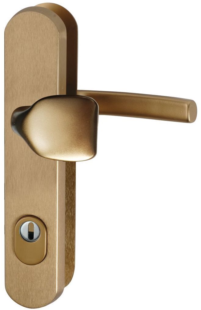 Kovanie na dvere – bezpečnostné, štítové, oválna rozeta, vo vyhotovení guľa – kľučka, vonkajšie, na pravé dvere, druh zámku PZ, materiál hliník, na hrúbku dverí od 40 do 55 mm, rozstup kľučky 72, zlatá farba…