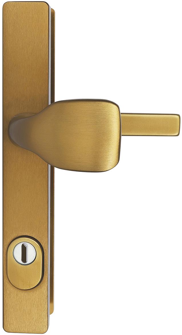 Kovanie na dvere – bezpečnostné, štítové, vo vyhotovení guľa – kľučka, vonkajšie, na pravé dvere, druh zámku PZ, materiál hliník, na hrúbku dverí od 66 do 80 mm, rozstup kľučky 90, matný povrch, zlatá farba Kovanie na dvere Richter Czech ochráni váš domov zvonka a zaručí dverám kompletnú funkčnosť. Na jednej strane disponuje guľou, na druhej kľučkou na otváranie aj zatváranie. Štítové vyhotovenie tvorí j