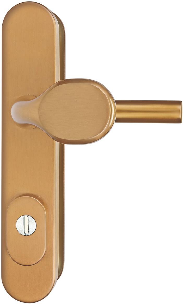Kovanie na dvere – bezpečnostné, štítové, oválna rozeta, vo vyhotovení guľa – kľučka, vonkajšie, na pravé dvere, druh zámku PZ, materiál nerez, na hrúbku dverí od 40 do 55 mm, rozstup kľučky 90, zlatá farba…