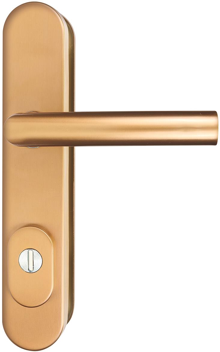 Kovanie na dvere – bezpečnostné, štítové, oválna rozeta, vo vyhotovení kľučka – kľučka, vonkajšie, na pravé dvere, druh zámku PZ, materiál nerez, zlatá farba Kovanie na dvere Richter Czech chráni vaše obydlie zvonka a zaručí dverám plnú funkčnosť. Na oboch jeho stranách je kľučka, ktorá umožňuje rýchle a pohodlné otváranie aj zatváranie. Ide o štítové vyho