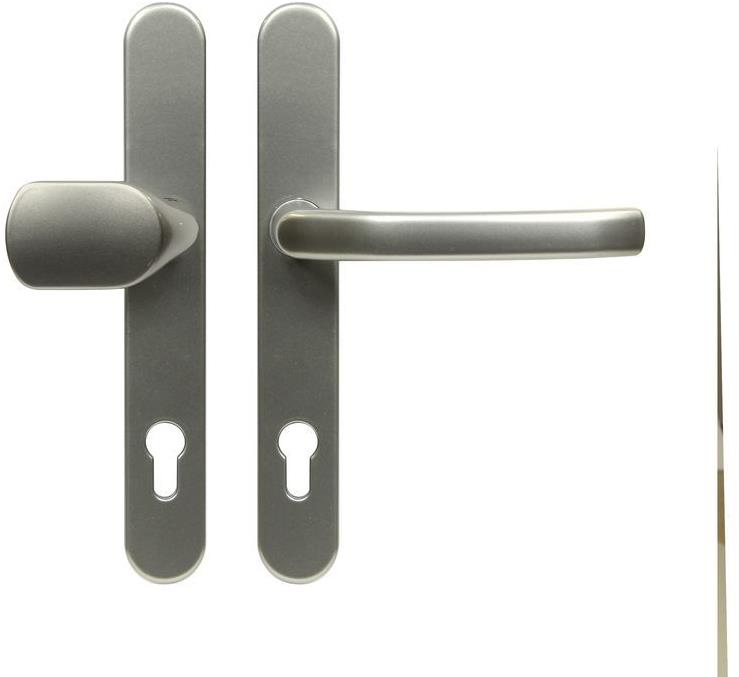 Kovanie na dvere – štítové, vo vyhotovení guľa – kľučka, vonkajšie, na ľavé dvere, druh zámku PZ, materiál hliník, na hrúbku dverí od 72 do 92 mm, rozstup kľučky 92, matný povrch, sivá farba Kľúčové…