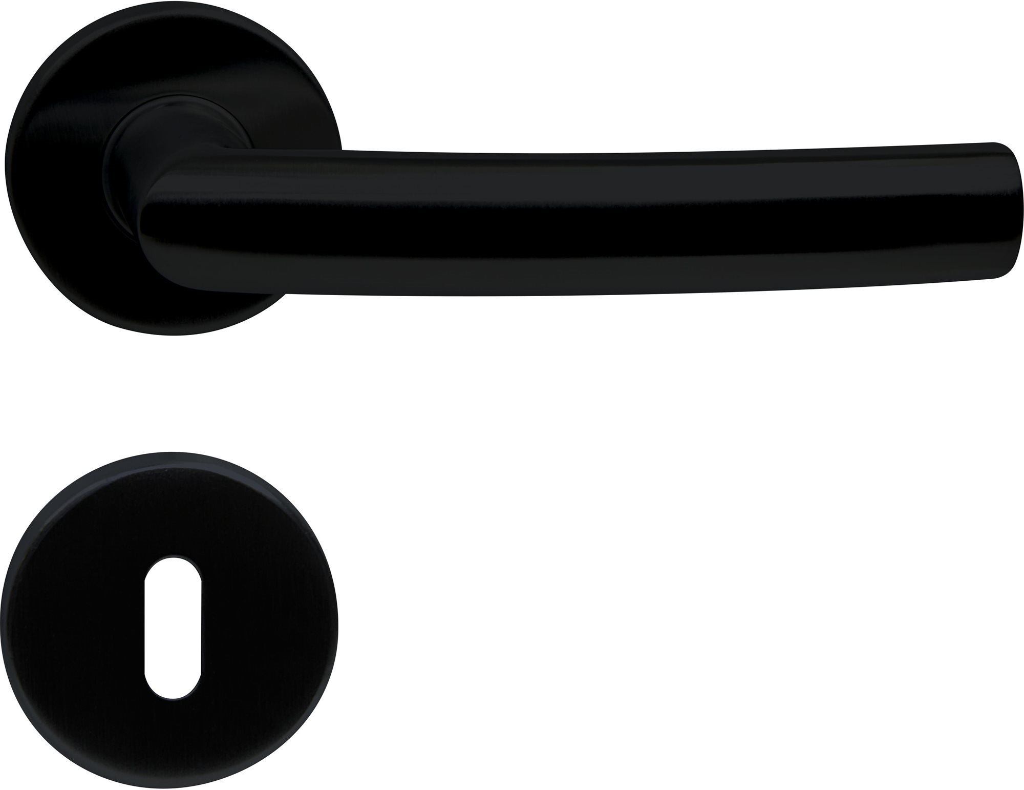 Kovanie na dvere – rozetové, okrúhla rozeta, vo vyhotovení kľučka – kľučka, vnútorné, na pravé dvere, druh zámku BB, materiál nerez, na hrúbku dverí od 32 do 77 mm, matný povrch, čierna farba Prisnilo sa…