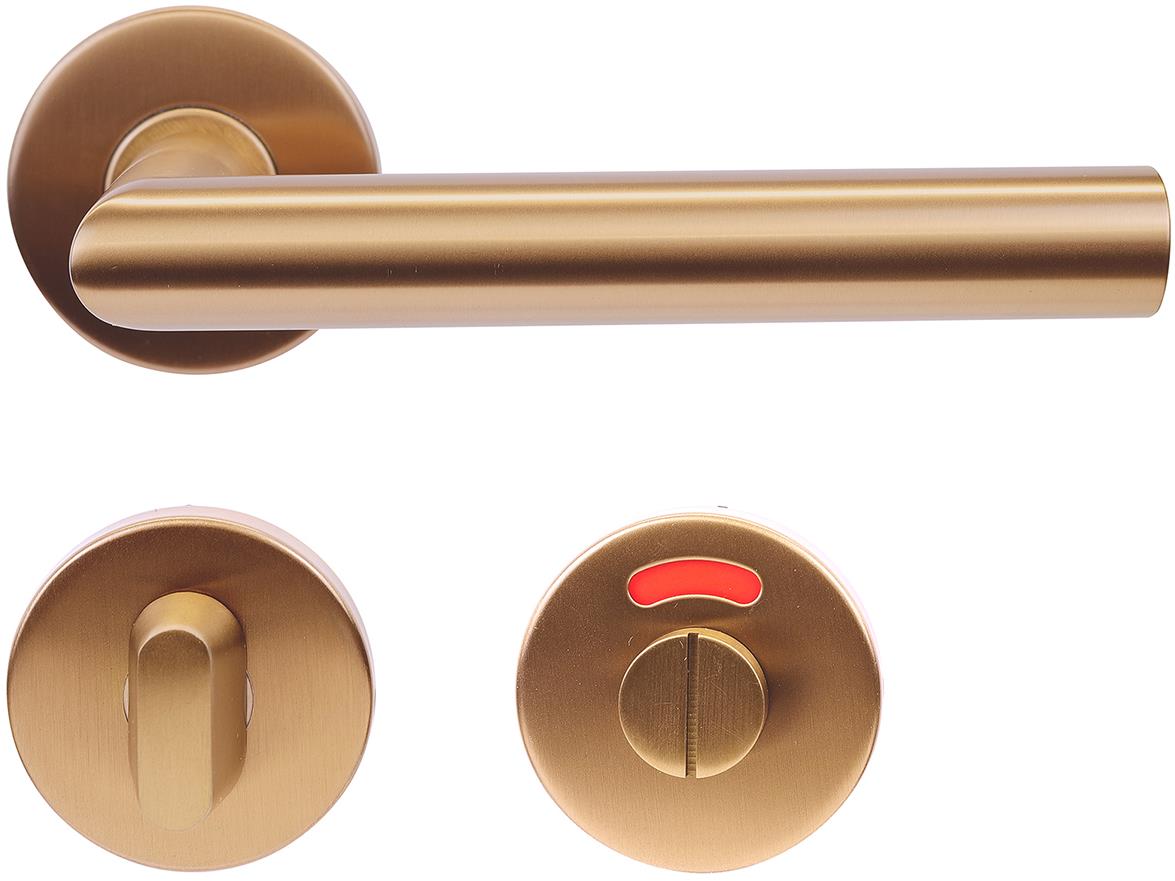 Kovanie na dvere – rozetové, okrúhla rozeta, vo vyhotovení kľučka – kľučka, vnútorné, na pravé dvere, druh zámku WC, materiál nerez, na hrúbku dverí od 32 do 77 mm, matný povrch, hnedá farba Nerezové kovanie na okrúhlych rozetách s vratnou pružinou. Praktické 2 súpravy skrutiek, bez nutnosti ich skracovania na dvere hrúbky 40 mm. Dodávané na hrúbku dverí 32 – 77 mm. Balenie vrátane spojov