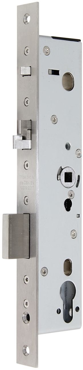 Zadlabávací zámok – samozamykací, pre kovanie guľa/kľučka, testované na triedu bezpečnosti 4 podľa CSN EN 12209: 2017 a triedu životnosti M podľa CSN EN 12209: 2017, z nerezovej ocele, strelka obojstranná pravoľavá, jednozápadová závora, čelo…