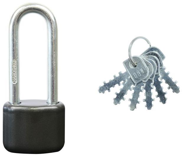 Visiaci zámok – materiál tela oceľ, vonkajšie použitie a tvrdený strmeň, 6 kľúčov súčasťou, rozmery strmeňa 70 × 21 mm (V׊), priemer strmeňa 9 mm, rozmery tela 116 × 50 × 33 mm (V׊×H) Visiaci…