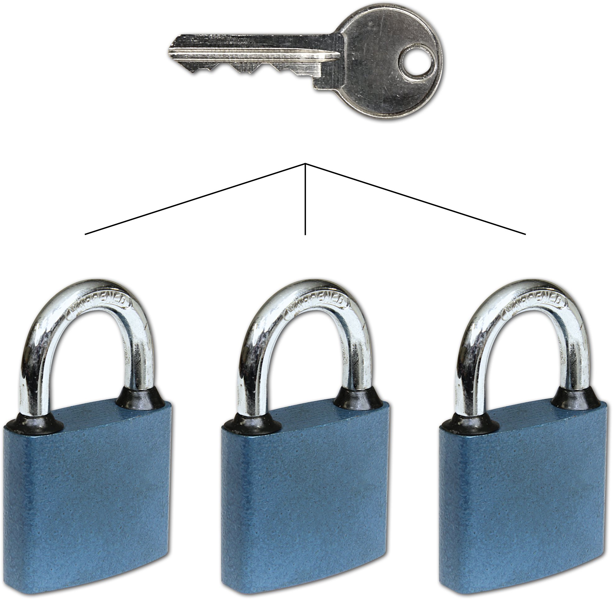 Visiaci zámok – odolný proti bumpingu, materiál tela oceľ, zamknutie bez kľúča, dvojbodové istenie a spoločný uzáver zámkov, 6 kľúčov súčasťou, rozmery strmeňa 25 × 24 mm (V׊), priemer strmeňa 7 mm, rozmery tela 70…