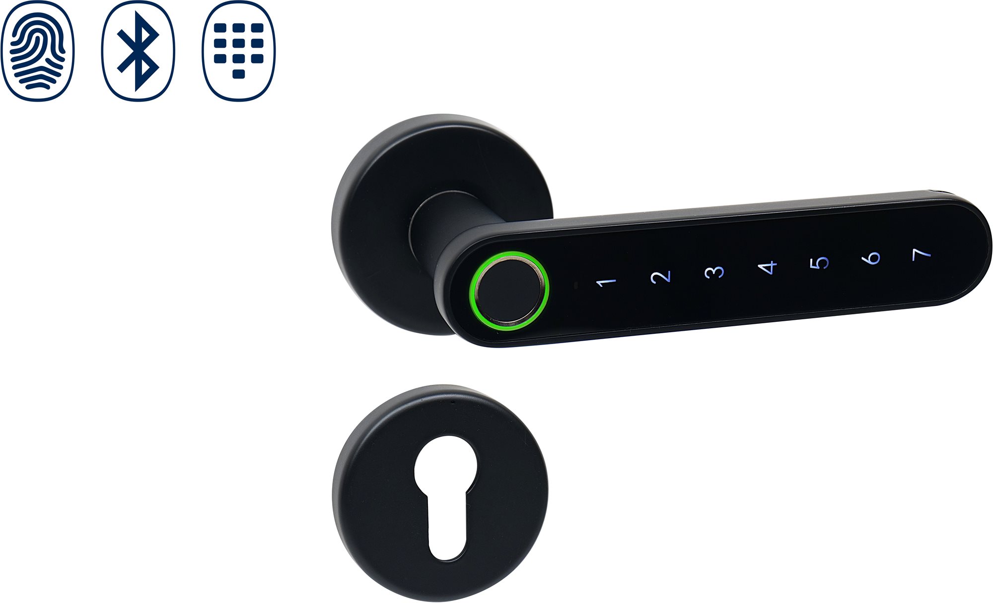 Kovanie na dvere – bezpečnostné, rozetové, okrúhla rozeta, vo vyhotovení kľučka – kľučka, vnútorné, na pravé dvere a ľavé dvere, materiál oceľ, na hrúbku dverí od 38 do 58 mm, matný povrch, čierna farba, čítačka odtlačkov prstov, klávesnica na vloženie PIN, zdieľanie prístupu, odomykanie pomocou Bluetooth a monitoring, podporuje Android a iOS, pripojenie cez bluetooth Inteligentná kľučka Smart Touch Handle H.03 je ideálna na zabezpečenie kancelárií, zasadacích miestností či skladov. Zo svojej vnútornej strany je kľučka vždy aktívna, zatiaľ čo z vonkajšej sa