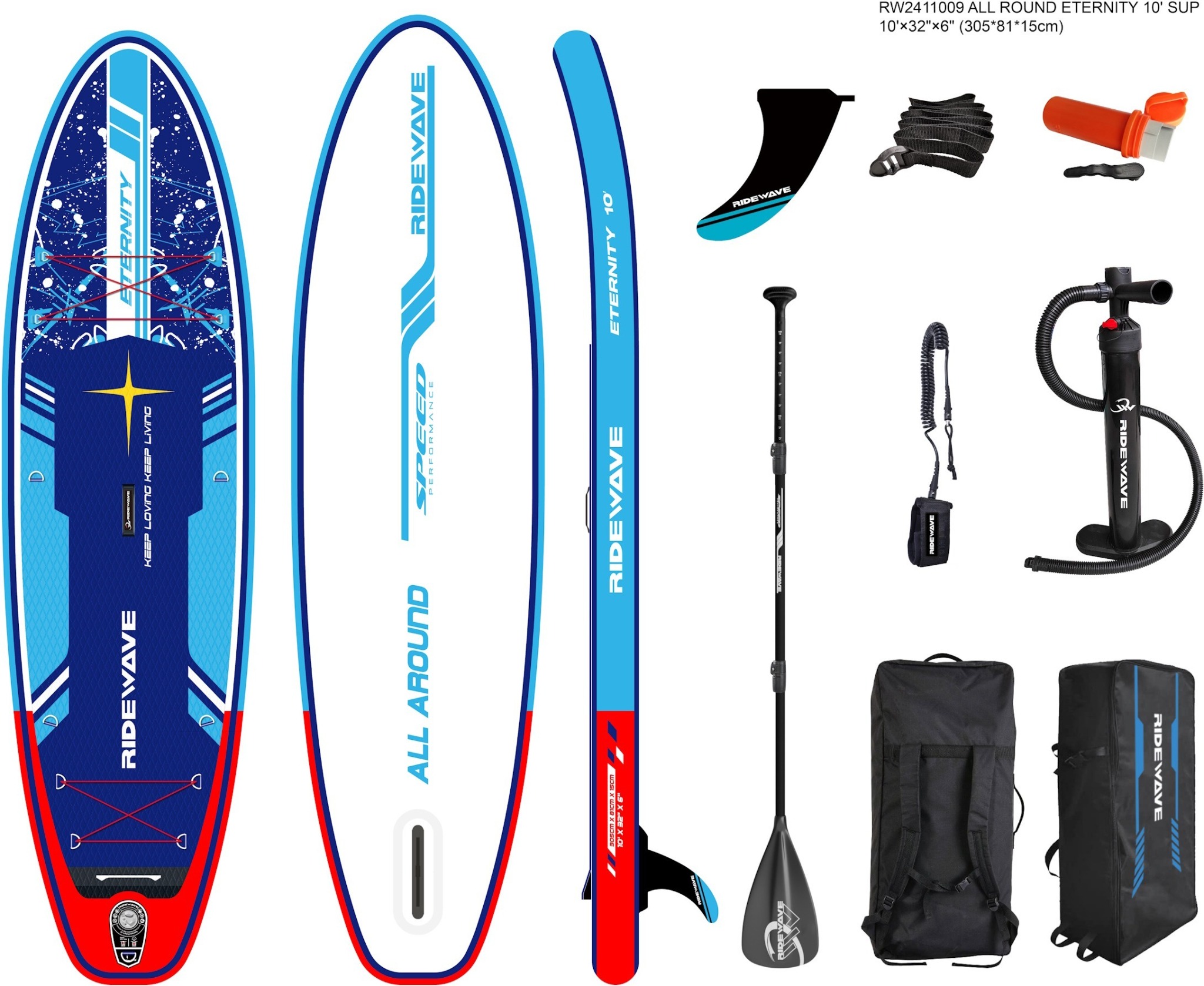 Paddleboard s dĺžkou 305 cm, nosnosť 143 kg, výtlak 305 l, zameranie: stabilita a ovládateľnosť, obsah balenia: pumpa, pádlo, plutva, opravná sada a leash Paddleboard RIDEWAVE Eternity 10′ je vyrobený z odolného štvorvrstvového PVC materiálu s dvojitým ochranným bočným lepením, ktoré zaisťuje vysokú pevnosť a dlhú životnosť. Plutva je vyrobená z kombiná