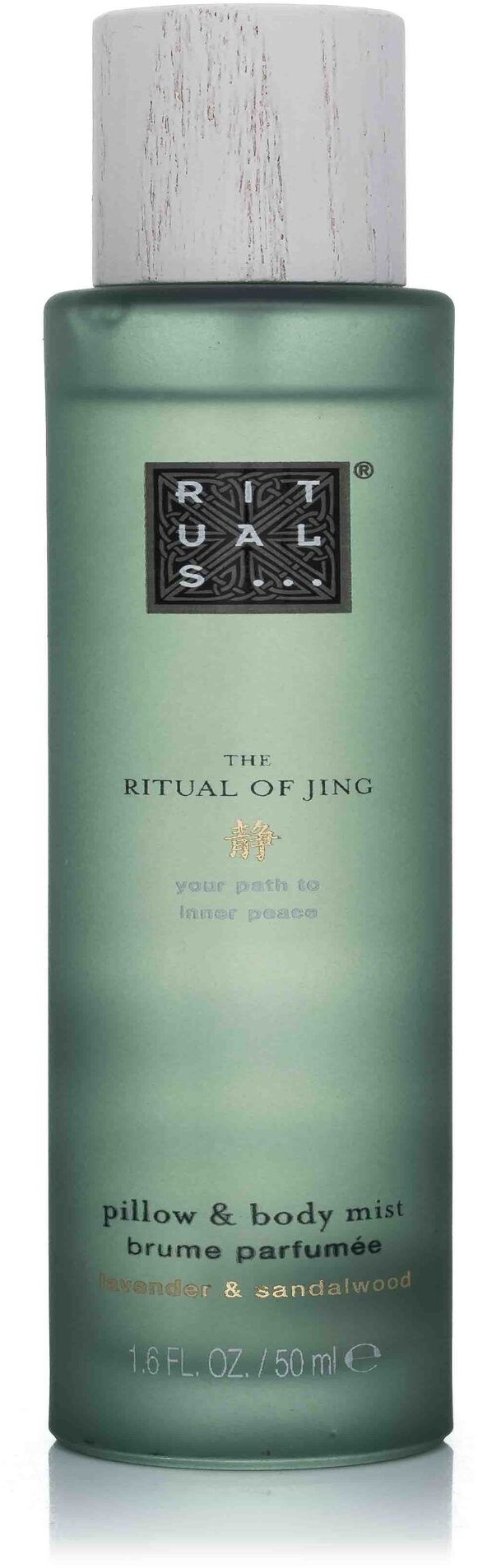 Telový sprej – vhodný na normálnu pokožku, relaxačný, nezanecháva škvrny a na každodenné použitie, aktívne látky levanduľa a santalové drevo, bez alkoholu a s prírodnými zložkami, levanduľová vôňa, objem 50 ml Telový sprej RITUALS Ritual of Jing Night Pillow & Body Mist s vôňou santalového dreva a levandule pomáha navodiť pocit harmónie a uvoľnenia, čo podporuje rýchlejšie zaspávanie a kvalitnejší odpoč