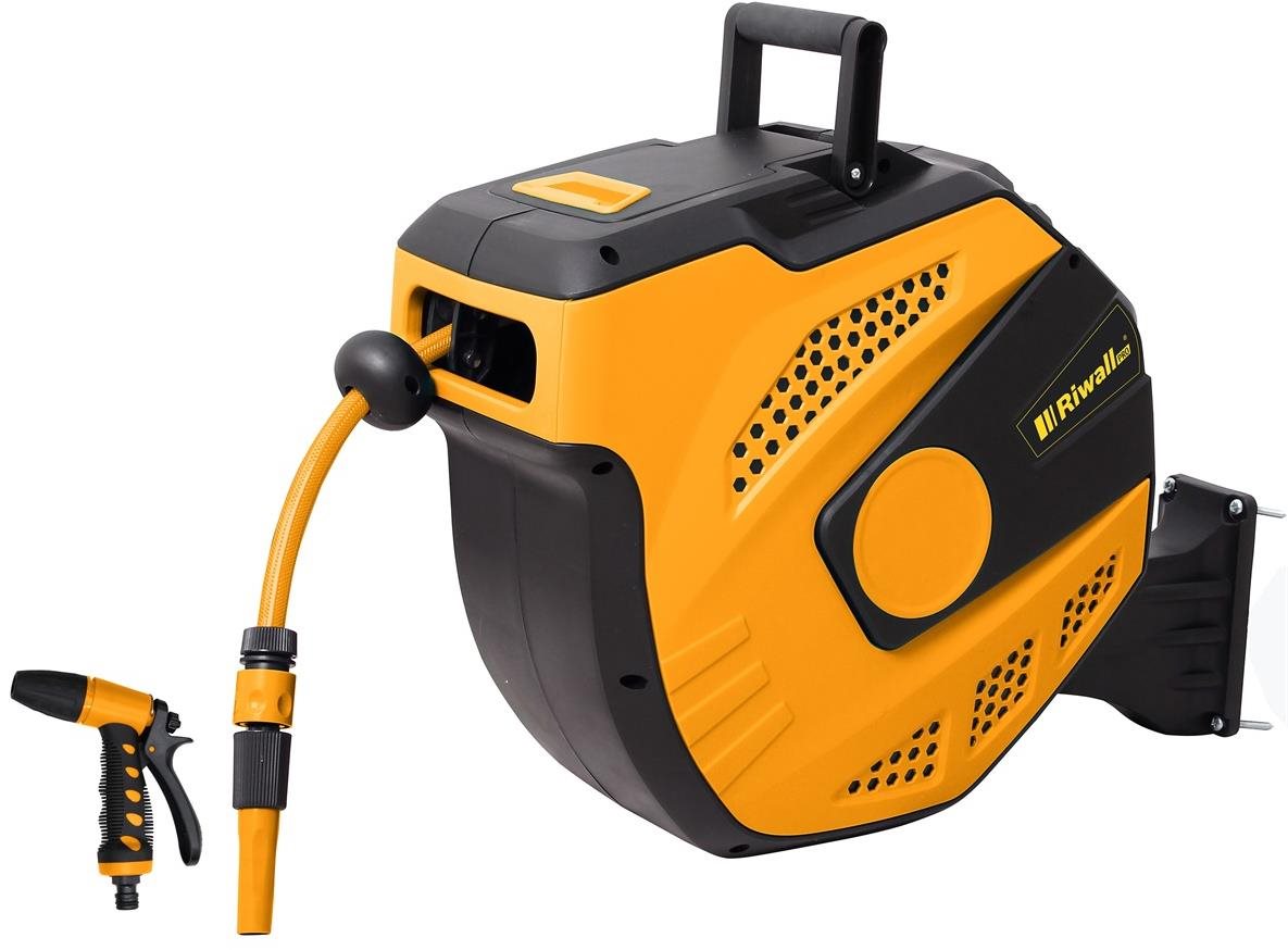 Bubon na hadicu – nástenný, dĺžka hadice 27 m, materiál hadice PVC, automatické navíjanie, odvíjanie s aretáciou, držadlo na prenášanie a otočný držiak, 1/2″ hadica súčasťou balenia, hmotnosť 10 kg RWHR 27 SET je ideálny pomocník pre každého, kto hľadá efektívne a pohodlné riešenie na manipuláciu so záhradnou hadicou. S týmto automatickým hadicovým navijakom Riwall bude údržba záhrady alebo čist