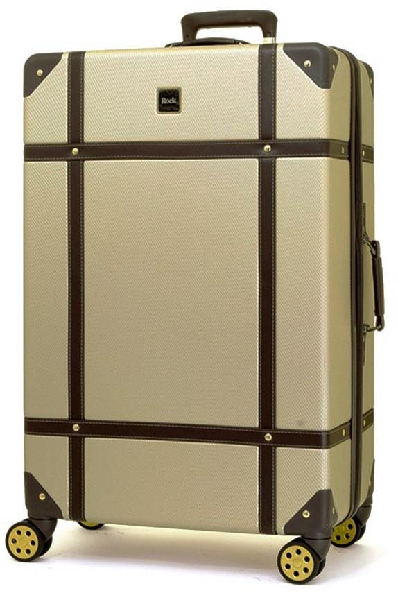Cestovný kufor – na kolieskach, veľký, škrupinový, objem 94 l, rozmery 78 × 51 × 29,5 cm (V׊×H), upínacie pásy a vnútorná deliaca priehradka, 4 otočné a zdvojené kolieska, zapínanie dvojcestným zipsom, TSA zámok, bočné a horné držadlo, zlatá farba, hmotnosť 4,6 kg Cestovný kufor z kolekcie ROCK Vintage je uzatvárateľný zipsom a je vyrobený z odolného ABS plastu. Oboch jazdcov zipsu sa dajú zapojiť do TSA zapusteného kódového zámku. Horné aj bočné madlo je zo sy