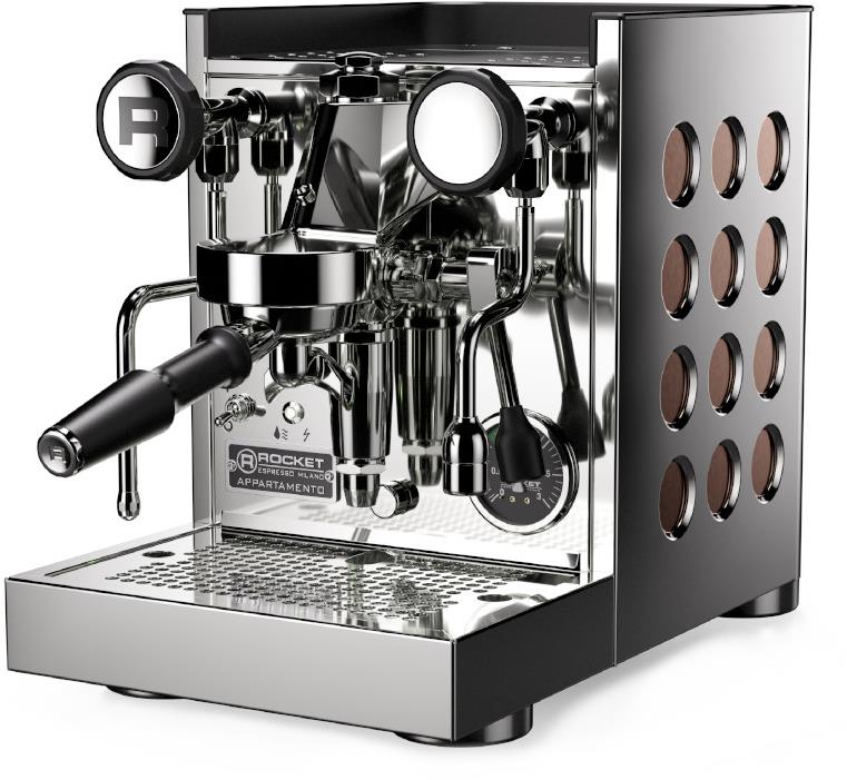 Pákový kávovar – príkon 1350 W, tlak 9 bar, štandardný portafilter, objem nádržky na vodu 2,5 l, možnosť prípravy dvoch šálok naraz, naparovacia dýza, nastavenie teploty nápoja, rozmery 38,5 × 27 × 44,8 cm (V׊×H), hmotnosť 22 kg Rocket Espresso s hrdosťou predstavuje úplne nový model Appartamento TCA – novú generáciu obľúbeného stroja Appartamento s možnosťou nastavenia teploty. Appartamento TCA je evolúciou ikonického kávova
