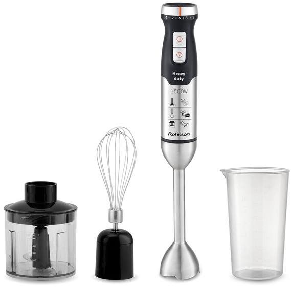 Tyčový mixér – príkon 1500 W, 9 rýchlostí, plynulá regulácia rýchlosti a turbo rýchlosť, funkcie: sekanie, šľahanie a mixovanie, 3 nože, maximálne otáčky 16000 ot./min, sekáčik so sekacou nádobou, mixovacia nádoba, šľahacia metla, úzka mixovacia noha a odmerka súčasťou balenia, materiál nohy nerez Sekáčik Rohnson – všestranný pomocník do každej kuchyneV kuchyni je dobré mať také nástroje, ktoré vám maximálne uľahčia prípravu rozmanitých pokrmov. Preto by vám v domácnosti nemal chýbať kvalitný t