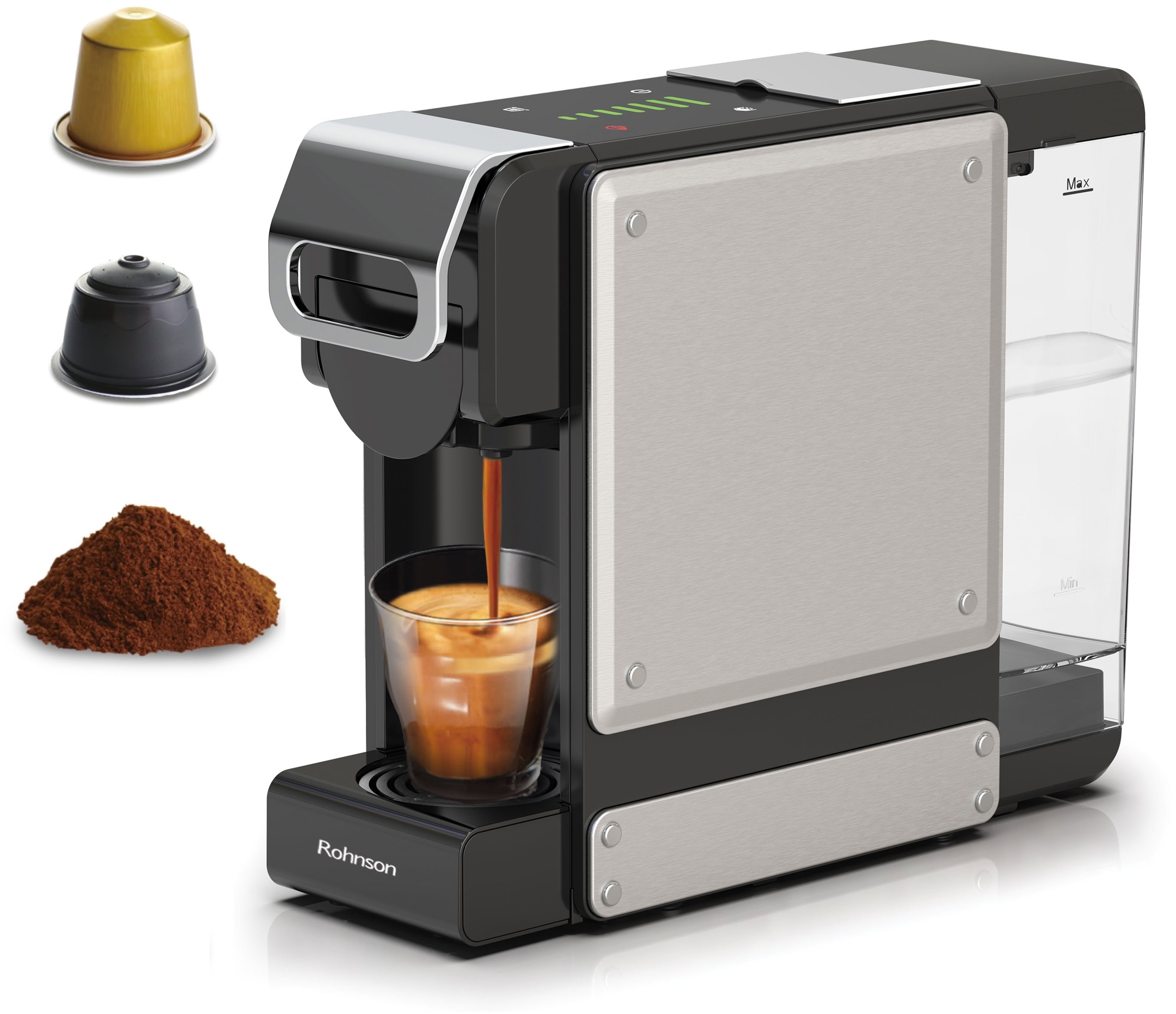 Kávovar na kapsuly – na viac druhov kapsúl, na kapsuly NESCAFÉ Dolce Gusto a Nespresso Original, príkon 1450 W, tlak 20 bar, objem nádržky na vodu 1 l, automatické vypnutie, s funkciou horúcej vody, pripravuje nápoj jedným stlačením, nádoba na vodu, manuálne tlačidlá, nastavenie veľkosti nápoja, rozmery 26 × 11,6 × 32,5 cm (V׊×H), hmotnosť 3,37 kg, čierna a strieborná farba Extra úzky multifunkčný kávovar Rohnson R-98044 3 v 1 v antikorovom dizajne ponúka profesionálnu prípravu kávy v kompaktnom vyhotovení. Vďaka vysokotlakovej extrakcii s tlakom 19 barov pripraví lahodn