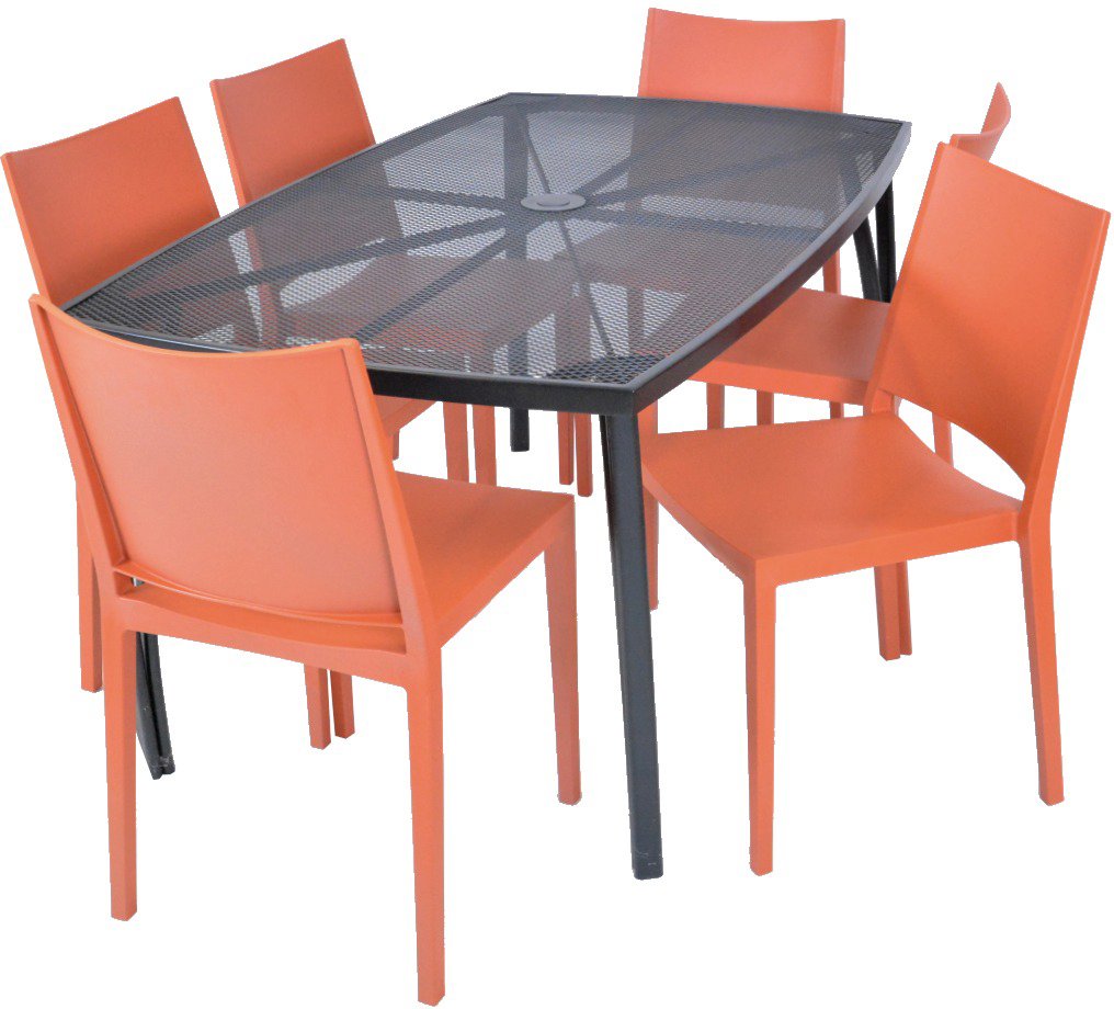 Záhradný nábytok – zostava, 6 stoličiek, nosnosť 150 kg, stôl obdĺžnik s otvorom na slnečník, rozmer 150 cm × 90 cm × 71 cm, materiál sedadla/opierky chrbta lavice plast Set záhradného nábytku ROJAPLAST obsahuje kovový obdĺžnikový stôl ZWMT-24 a šesť záhradných stoličiek MOSK v čiernom a oranžovom farebnom vyhotovení. Je nielen elegantným doplnkom pre vaše vonkajšie p