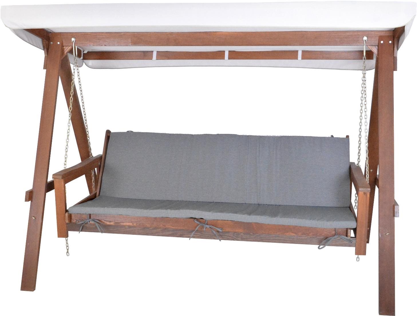 Záhradná hojdačka – drevená, pre 3 osoby, so strieškou, s podsedákmi, rozkladacia, materiál sedadla/opierky chrbta drevo, materiál striešky polyester, druh dreva borovica, rozmery 170 × 235 cm (V׊) výška operadla 58 cm, šírka sedadla 183 cm, hĺbka sedadla 50 cm, výška sedu 45 cm, maximálna nosnosť 270 kg, hmotnosť 45 kg Robustná konštrukcia záhradnej hojdačky ADELAIDA z moreného borovicového dreva v hnedej farbe zaručuje vysokú pevnosť a dlhú životnosť produktu. Operadlo je možné sklopiť a vytvoriť tak lôžkovú úpravu