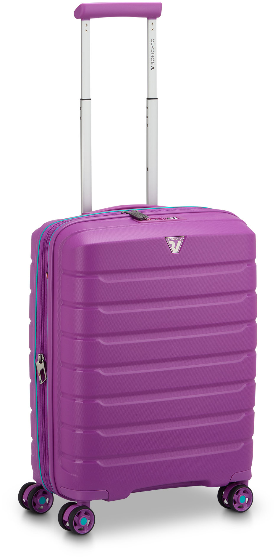 Cestovný kufor – na kolieskach, malý, škrupinový, objem 40 l, rozmery 55 × 40 × 20 cm (V׊×H), expander, upínacie pásy, vnútorné vrecko a vnútorná deliaca priehradka, 4 otočné, zdvojené a tiché kolieska, zapínanie dvojcestným zipsom, TSA zámok, teleskopické a horné držadlo, fialová farba, hmotnosť 2,4 kg Cestovný kufor Roncato B-Flying je vyrobený zo 100 % polypropylénu, čo zaručuje vysokú odolnosť proti nárazom a poškriabaniu. Aj keď je tento materiál extrémne pevný, je tiež veľmi ľahký, čo umožňuje