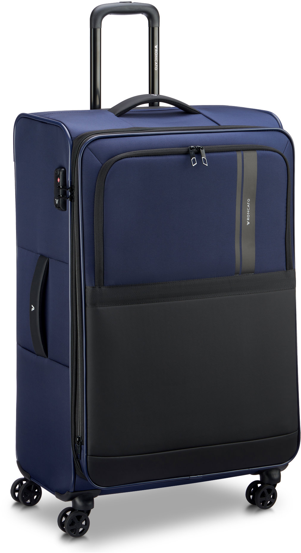 Cestovný kufor – na kolieskach, veľký, textilné, objem 105 l, rozmery 78 × 48 × 30 cm (V׊×H), expander, upínacie pásy, vonkajšie vrecko a vnútorné vrecko, 4 otočné, zdvojené a tiché kolieska, zapínanie dvojcestným zipsom, TSA zámok, teleskopické, bočné a horné držadlo, modrá farba, hmotnosť 3,9 kg Cestovný kufor Roncato METROPOLITAN je ľahký textilný kufor, ktorého povrch je vyrobený zo 100 % 600D nylonu, čo mu dodáva vysokú odolnosť voči opotrebovaniu a zároveň nízku hmotnosť. Plynulý pohyb ku