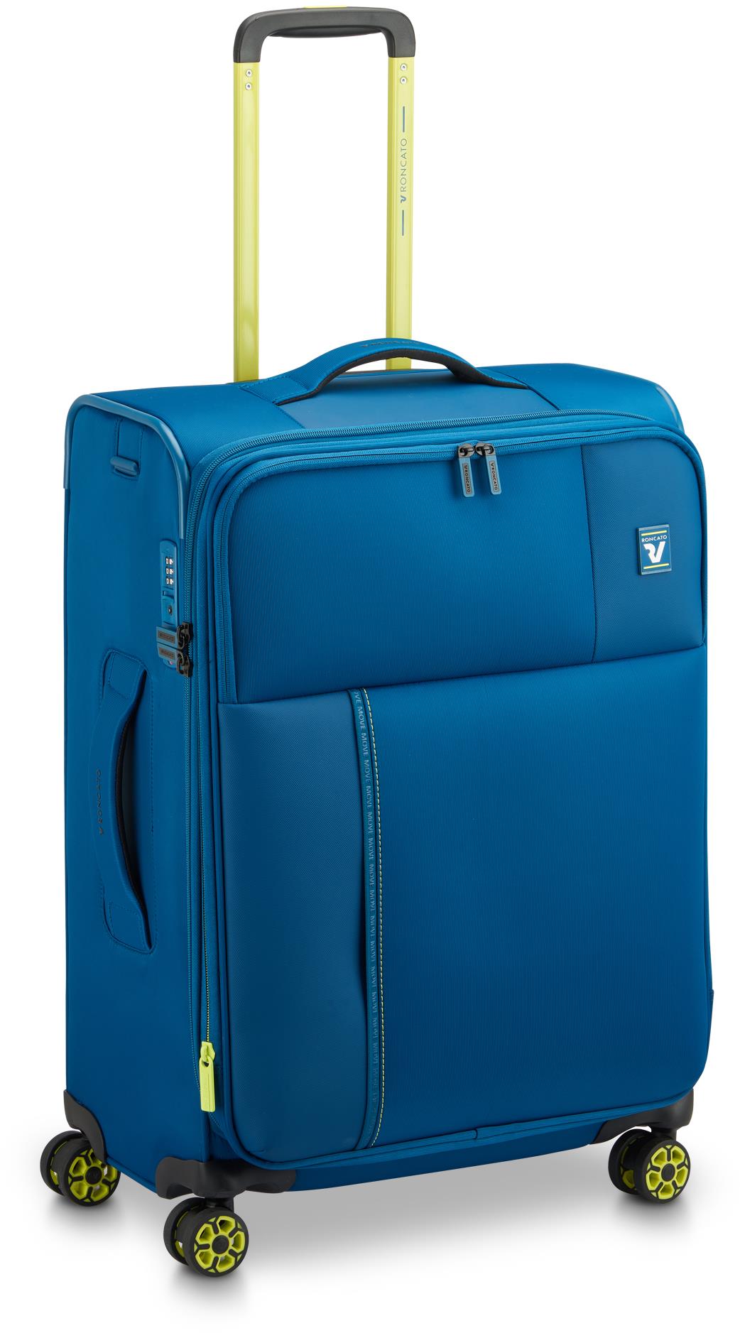Cestovný kufor – na kolieskach, stredný, textilné, objem 68 l, rozmery 64 × 44 × 26 cm (V׊×H), expander, upínacie pásy, vonkajšie vrecko a vnútorná deliaca priehradka, 4 otočné, zdvojené a tiché kolieska, zapínanie dvojitým bezpečnostným zipsom, TSA zámok, teleskopické, bočné a horné držadlo, modrá farba, hmotnosť 3,2 kg Cestovný kufor SOFT z kolekcie MOVE od značky RONCATO zaisťuje maximálny komfort pri cestovaní vďaka štyrom dvojitým kolieskam otočným o 360°, výsuvnému dvojitému držadlu s nastaviteľnou výškou a rozš