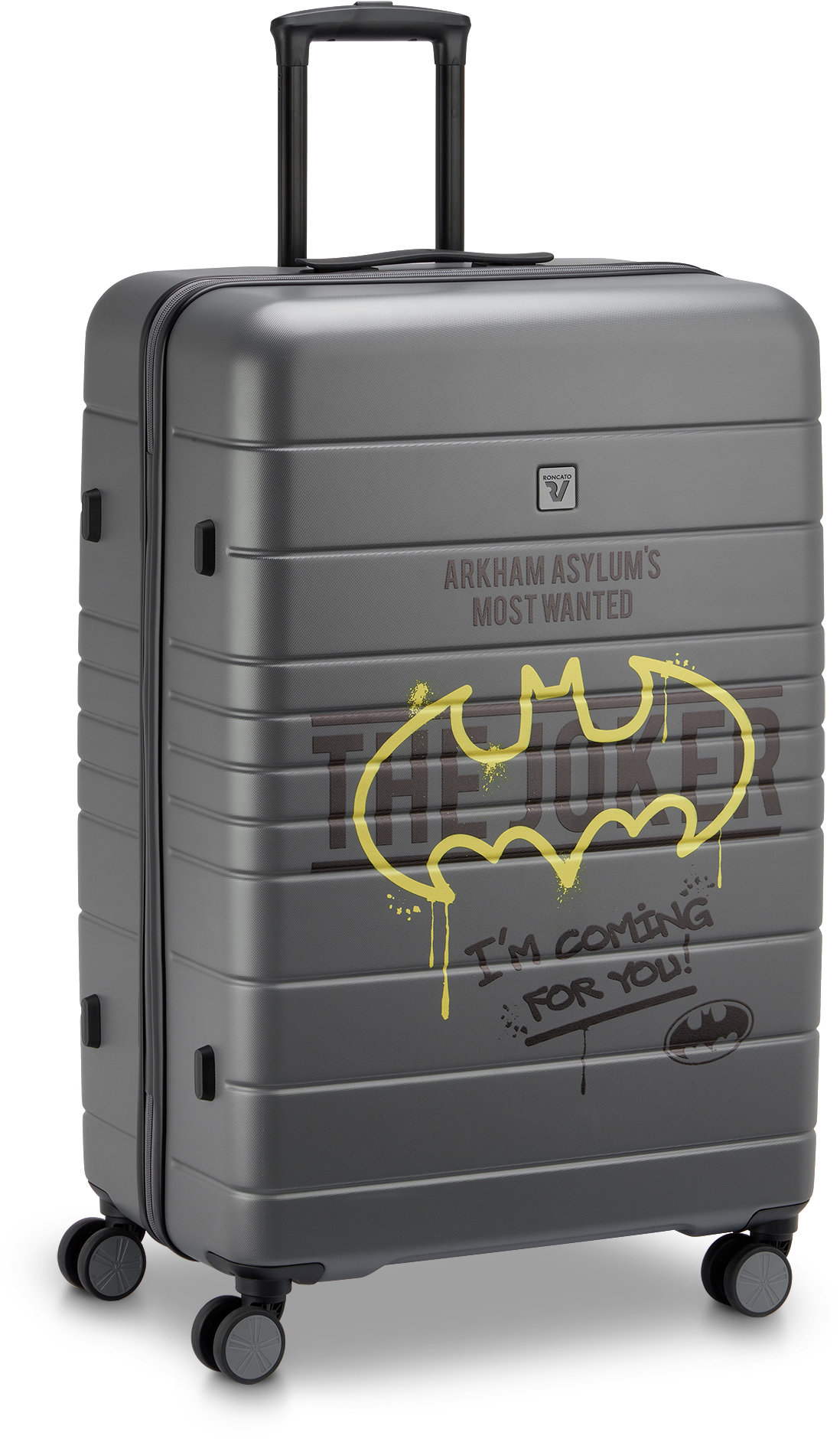 Cestovný kufor – na kolieskach, veľký, škrupinový, objem 106 l, rozmery 77 × 50 × 29,5 cm (V׊×H), upínacie pásy, vnútorné vrecko a vnútorná deliaca priehradka, 4 otočné, zdvojené a tiché kolieska, zapínanie dvojcestným zipsom, TSA zámok, teleskopické, bočné a horné držadlo, sivá a žltá farba, filmový motív, hmotnosť 4,4 kg Cestovná batožina Roncato WARNER DC L s jedinečnou grafikou odkazujúcou na legendárnu postavu DC Batmana od Warner Bros Vás vtiahne do nezameniteľnej atmosféry Gotham City. Kufor Roncato Warner DC je
