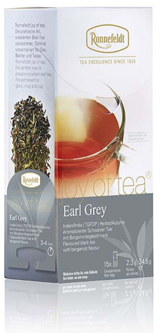 Čaj – čierny, vrecká, jednodruhový, indický, hmotnosť 35 g Ronnefeldt Joy of Tea Earl Grey15 porcií. Ronnefeldt čaj Earl Grey je zmesou prvotriednych čajových lístkov Darjeeling jemne ochutených bergamotovou silicou, tá dodáva kvetinovo-ovocné chuti Darjeelingu