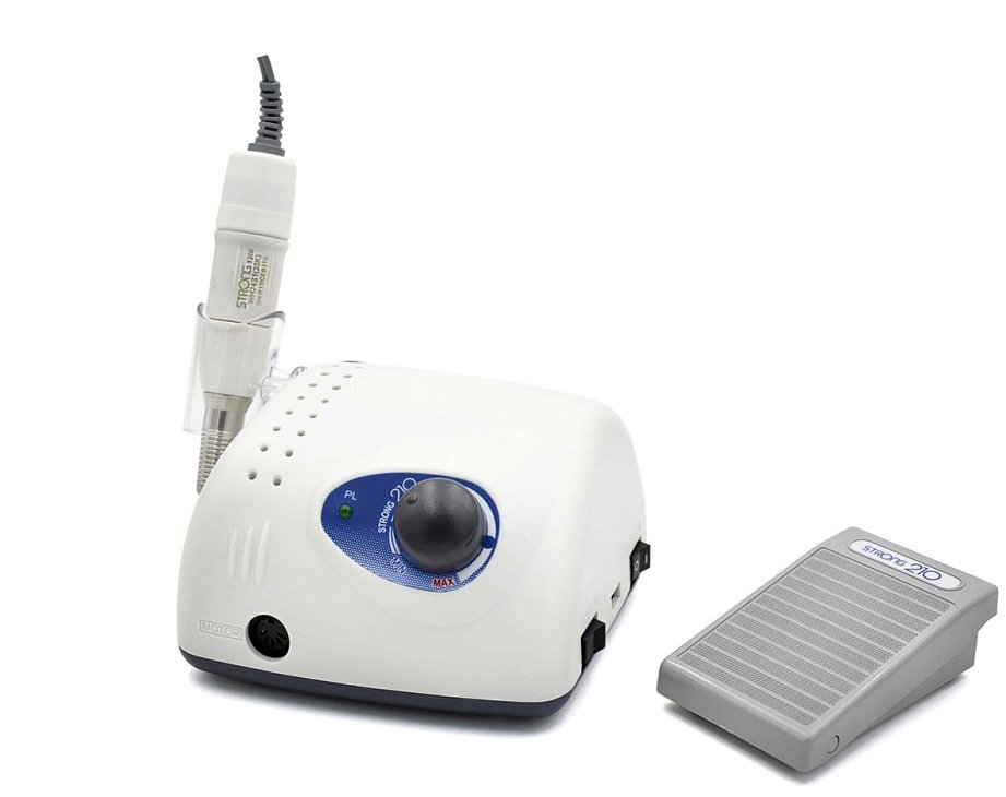 Brúska na nechty – na manikúru aj pedikúru, na umelé a prírodné nechty, vhodná na domáce a profesionálne použitie, napájanie zo siete, výkon 50 W, maximálne otáčky 35000 ot./min, 64 rýchlostí, obojstranné otáčanie, poistka proti náhlemu zopnutiu, tichý chod, regulácia rýchlosti, ergonomická rukoväť a protišmyková úprava, biela farba, držiak na rukoväť, nožný pedál, nabíjací adaptér, návod a 1 nadstavec v balení Profesionálny prístroj na manikúru a pedikúru SAESHIN Strong 210/105L kombinuje vysoký výkon, precíznosť a pohodlie pri práci. Elektrický pilník je určený nielen na úpravu nechtov, ale aj ich predlžov