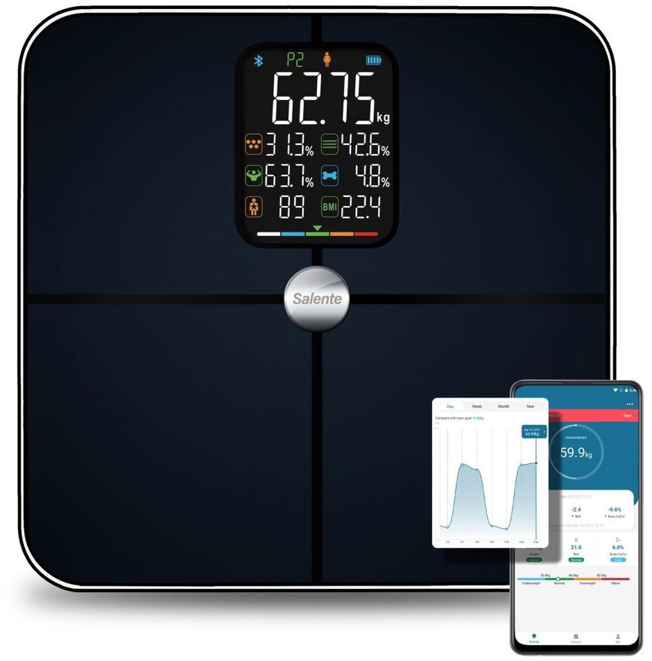Osobná váha – digitálna diagnostická, smart, nosnosť 180 kg, meranie tuku, meranie svalov, meranie vody, uloženie dát, párovanie s mobilnou aplikáciou, meranie kostného tkaniva, automatické zapnutie a vypnutie, meranie bmi a meranie dennej spotreby kalórií, možnosť pripojenia cez Bluetooth, materiál dosky sklo, presnosť merania 50 g, 4 senzory, kompatibilná s OS Android a iOS, na napájanie slúži AAA batéria, čierna farba Inteligentná osobná váha Salente BodyFitInteligentná osobná váha Salente BodyFit vám pomôže pochopiť komplexné hodnoty vášho tela. Vďaka pokročilej metóde bioelektrickej impedančnej analýzy vám s ľahk