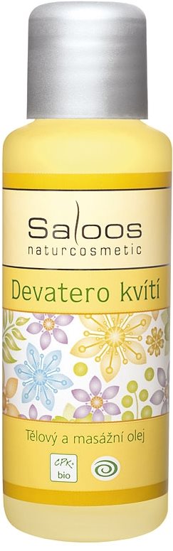 Masážny olej 50 ml – vhodný na mastnú, normálnu, zmiešanú, suchú a zrelú pleť, proti svrbeniu kože a na suchú pokožku, s prírodným olejom, aktívne látky esenciálne oleje, makadámiový olej, mandľový olej, olej z marhule, sezamový olej a slnečnicový olej, BIO SALOOS telový a masážny bio olej Devatero kvety je jedinečnou zmesou olejov lisovaných za studena a prírodných esenciálnych olejov, ktoré poskytujú úľavu natiahnutému chrbtu, stuhnutým svalom i kĺbom.