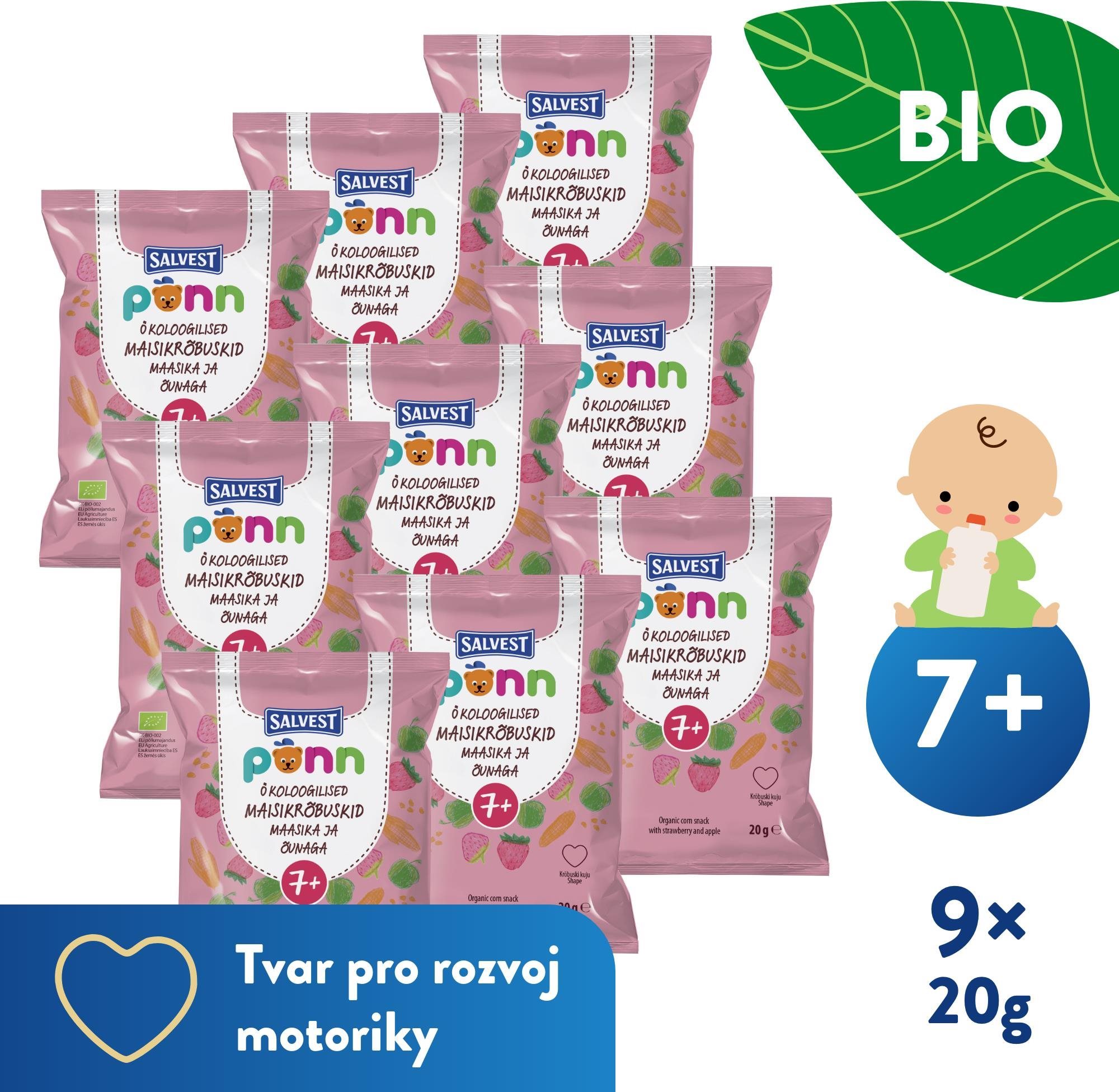 Chrumky pre deti vhodné od 7 mesiace, bez konzervantov a umelých farbív, lepku, pridaného cukru, prídavku soli a palmového oleja Salvest Ponn Bio chrumkyJahodové chrumky od estónskej značky Salvest Ponn v bio kvalite skvele padnú do rúk a pomáhajú zlepšovať jemnú motoriku detí. Navyše výborne chutia a sú obohatené vitamínom B1