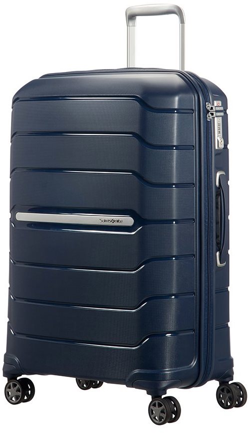 Cestovný kufor – na kolieskach, stredný, škrupinový, objem 95 l, rozmery 68 × 47 × 30 cm (V׊×H), menovka, upínacie pásy a vnútorná deliaca priehradka, 4 otočné kolieska, zapínanie zipsom, TSA zámok, teleskopické, bočné a horné držadlo, modrá farba, hmotnosť 3,5 kg Cestovný kufor Samsonite Flux Spinner 68/25 Expander Navy Blue je spoľahlivým a moderným spoločníkom pre dlhšie dovolenky aj pracovné cesty. Kufor strednej veľkosti sa pýši pevnou škrupinovou konštruk