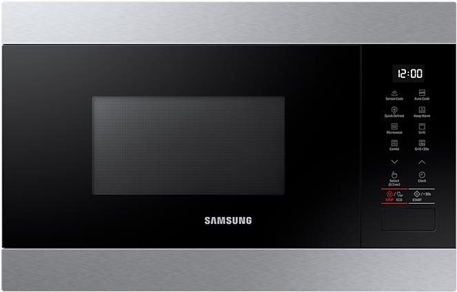 Mikrovlnná rúra – vstavaná, príkon 2400 W, dotykový displej, vnútorný objem 22 l, 6 úrovní výkonu, 1300 W výkon mikrovlnného ohrevu, disponuje grilom s výkonom 1100 W, 25,5 cm otočný tanier, rozmrazovanie a gril, automatické programy, časovač a detská poistka, otváranie dvierok doľava, grilovacia mriežka súčasťou, vonkajšie rozmery 38 × 59,5 × 32 cm (V׊×H), vnútorné rozmery 22,4 × 33 × 29,2 cm (V׊×H) Servírujte lahôdky aj z mikrovlnnej rúry Samsung MG22M8274AT/E2Oslňte svojich hostí nielen chuťou, ale aj vzhľadom vašich pokrmov. Vďaka programu Grill+30sec, ktorý prináša mikrovlnná rúra Samsung MG2