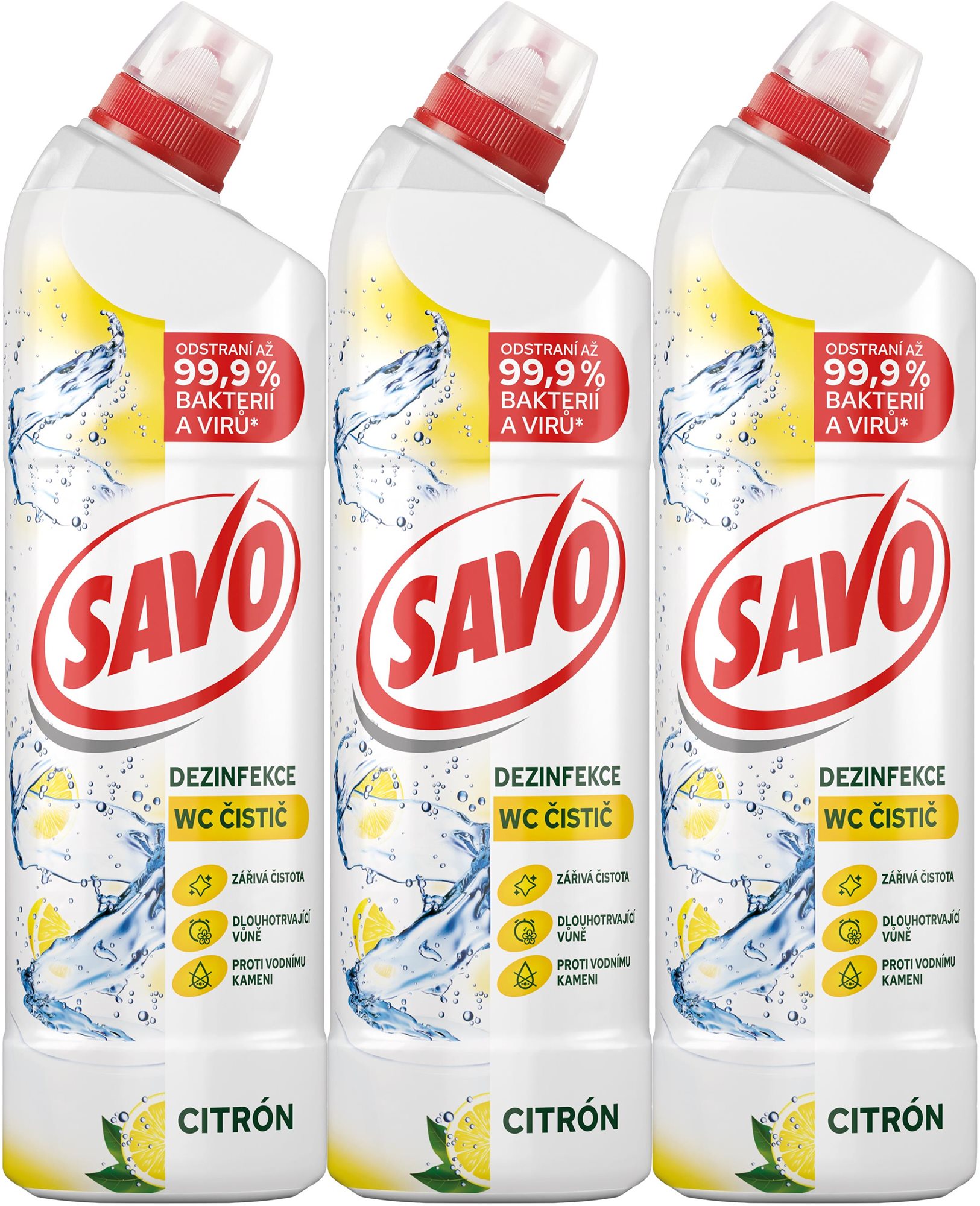 WC čistič – ovocná vôňa, bez chlóru, dezinfekčný, na vodný kameň, objem balenia 2100 ml, 3 kusy v balení SAVO WC Gél Citrón je vysoko účinný tekutý dezinfekčný čistič toalety, ktorý sa postará o žiarivý lesk, hygienickú čistotu a dlhotrvajúcu sviežosť vašej toalety. Vďaka svojmu zloženiu l ikviduje až 99
