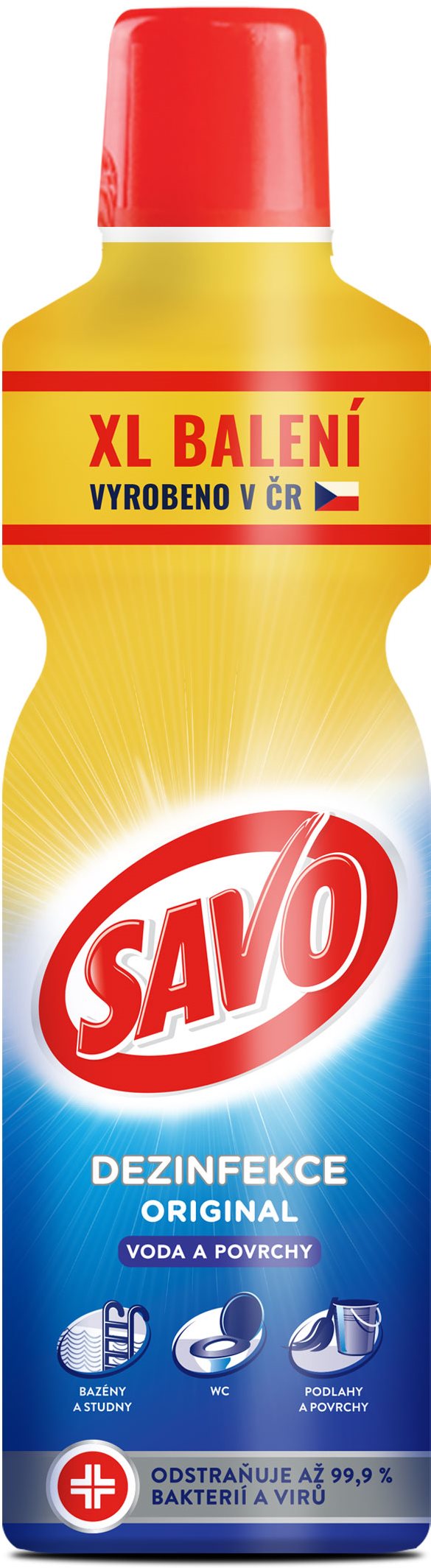 Dezinfekcia – univerzálna, bez aplikátora, objem 1200 ml Dezinfekčný prostriedok SAVO Original je určený na dezinfekciu všetkých umývateľných povrchov v domácnosti, hračiek, pomôcok pre domácich miláčikov, na údržbu podláh, ale aj na dezinfekciu vody v stud