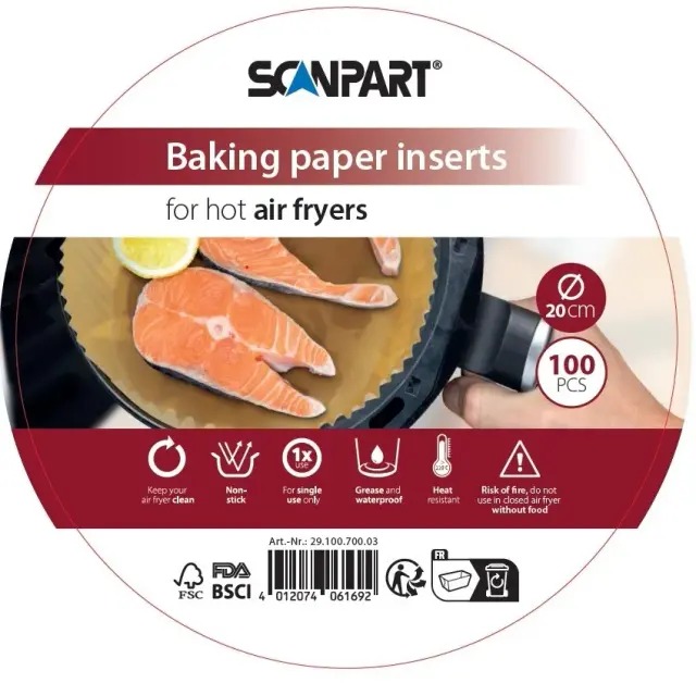 Papier na pečenie –, maximálna teplota 120 °C, 100 kusov v balení Kľúčové prednosti papiera na pečenie ScanPart SCA2910070003 20 cm 100 ks Papier na pečenie ScanPart zabráni pripáleniu pokrmu k plechu Najvyššia možná teplota pečenia 120 °C Rozmery papiera na pečenie