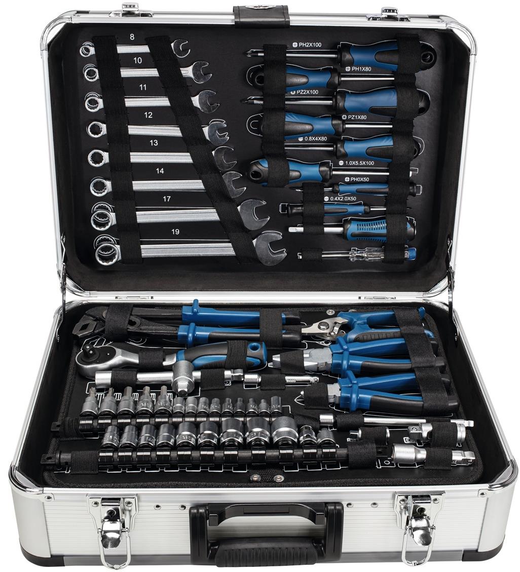 Sada náradia – 101 ks ukrytá v robustnom celokovovom kufri, každý kus náradia má presne stanovené miesto a bude tak vždy a rýchlo poruke, aj vďaka svojim rozmerom kufor nezaberie veľa miesta, dá sa pomocou praciek pevne uzavrieť a zamknúť a môžete ho ľahko preniesť na miesto, kde budete náradie potrebovať Súprava náradia Scheppach TB 150 nadchne profesionálov aj domácich majstrov. Obsahuje 101 dielov, ktoré sú uložené v praktickom kovovom kufri. Každé náradie je uschované na svojom mieste a budete ho t