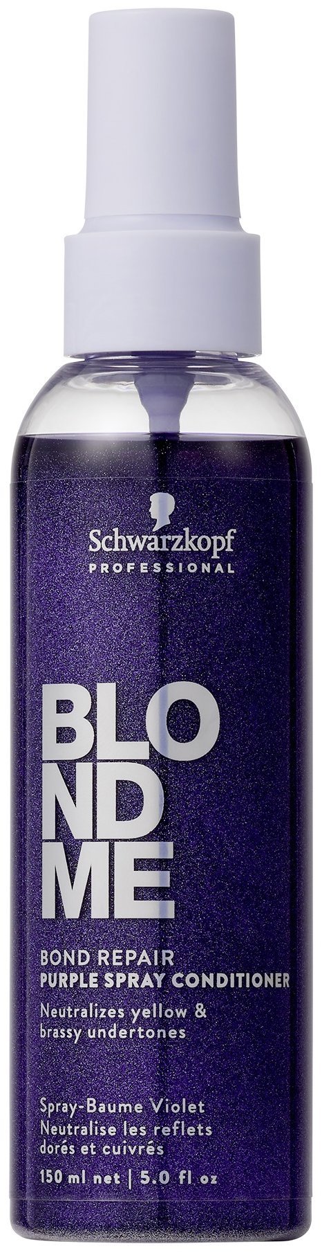 Sprej na vlasy unisex – vyhotovenie: profesionálne, na blond vlasy, chráni pred vyblednutím, hydratácia a výživa, objem 150 ml Fialový kondicionér v spreji SCHWARZKOPF Professional BlondMe Bond Repair poskytuje komplexnú starostlivosť blond a zosvetľovaným vlasom. Okamžite uzatvára vlasovú kutikulu, ktorá zostáva po umývaní o
