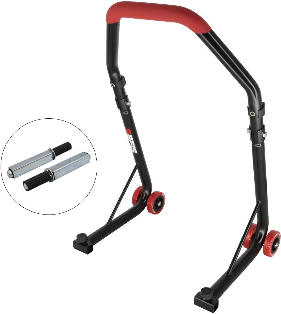 Stojan na motorku – pre väčšinu motocyklov, kvalitné spracovanie, stabilná celokovová konštrukcia, hrubý oceľový rúrkový profil 32 mm, spevňovacia výstuž, nosnosť 200 kg na jednu stranu motocykla, kovový úchyt adaptéra s poistnou skrutkou, kvalitný a tvrdý odolný lak, dvojité PVC kolieska, vložka pre servisný pin (pin nie je súčasťou balenia, možno dokúpiť samostatne), rozložiteľný na prevoz a skladovanie, obsah balenia: stojan a adaptér SEFIS D18 predný stojan na motorku – červený – single pre väčšinu motocyklov, kvalitné spracovanie, stabilná celokovová konštrukcia, silný oceľový rúrkový profil 32 mm, spevňovacia výstuž, nosnosť 200