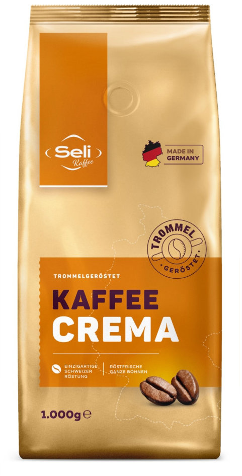 Káva – zrnková, zmes kávových odrôd, stredný stupeň praženia, pôvod Južná Amerika, Stredná Amerika a Ázia, miesto praženia Nemecko, vegan, hmotnosť balenia 1000 g, 110 porcií, bez alergénov Seli Kaffee Cremazrnková káva, 1 000 gSeli Kaffee CremaZmes Seli Crema kombinuje 90 % Robusty na plné telo a 10 % Arabiky na zjemnenie chuťového profilu. Je navrhnutá pre tých, ktorí pri svojej káve v