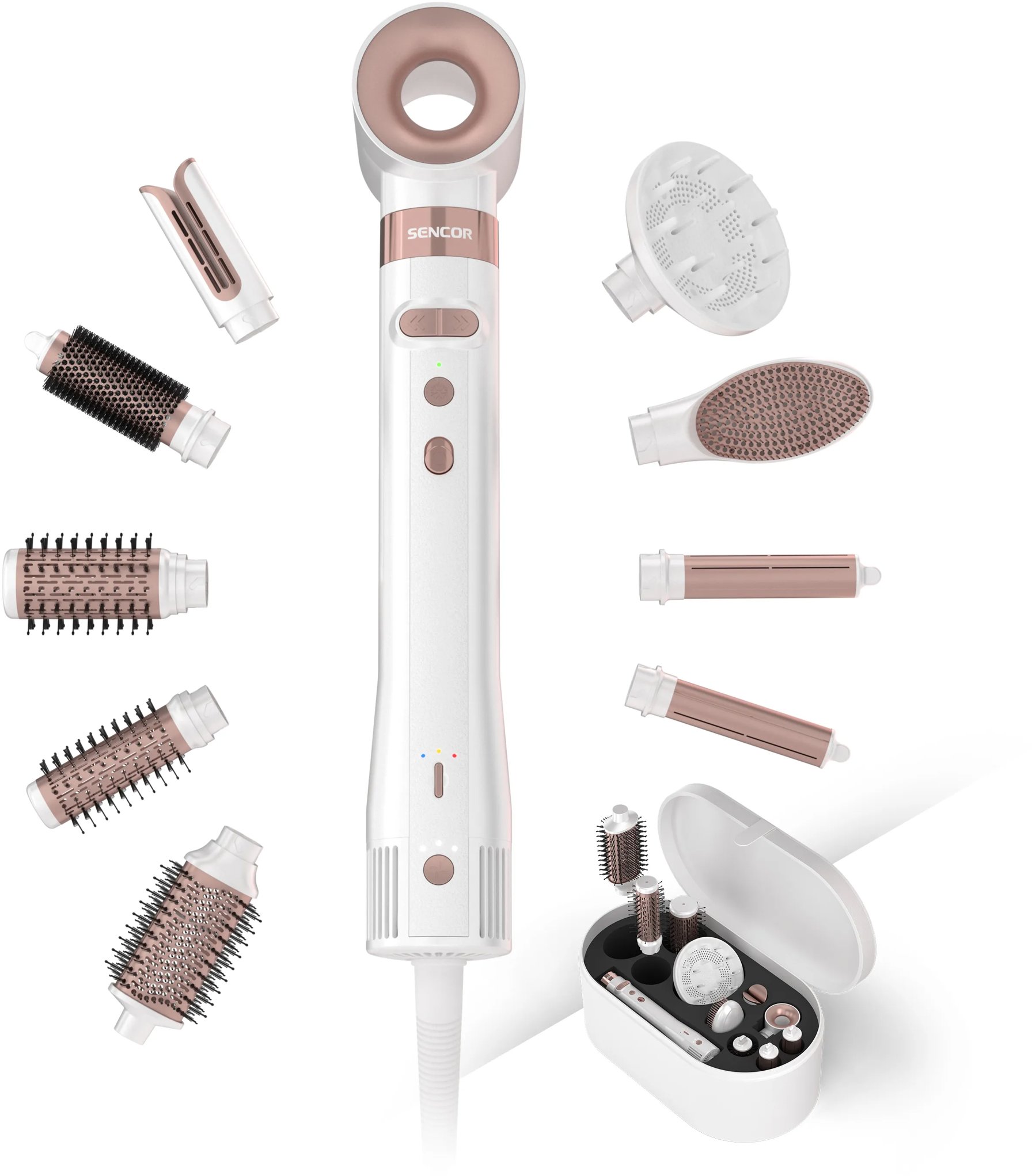 Kulmofén – rotačný, 4 teploty, minimálna teplota 20 °C, maximálna teplota 72 °C, 3 rýchlosti, príkon 1500 W, dĺžka kábla 1,8 m, rozmery 26,7 × 5 × 5 cm (V׊×H), hmotnosť 0,48 kg, 10 nadstavcov, úložný box súčasťou balenia, biela farba KulmofénArtemiss SHS 9200RSStarajte sa o svoje vlasy s prémiovým kulmofénomVysokorýchlostný kulmofén Sencor SHS 9200RS Artemiss ponúka vlasom šetrnú starostlivosť a profesionálny výkon.