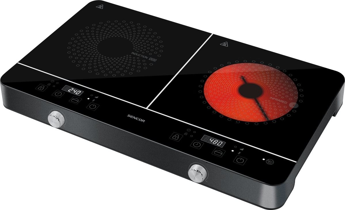 Indukčný varič s príkonom 3400 W, počet platničiek 2, počet programov 10, termostat, ochrana proti prehriatiu, automatické vypnutie, protišmykové nožičky, svetelný indikátor prevádzky, detská poistka, automatická detekcia riadu, časovač, LCD displej, dotykové ovládanie a nastavenie teploty, rozmery 34 cm × 58 cm × 7,5 cm, farba čierna Indukčný varičSCP 4001BKKombinácia indukčnej a sálavej platničkyDvojplatničkový indukčný a sálavý varič SENCOR SCP 4001BK. Sklokeramický povrch indukčnej platničky je studený na dotyk, pretože teplo s