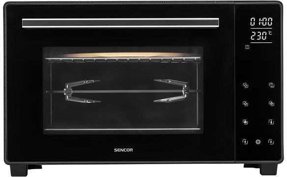 Mini rúra – elektrická, príkon 1700 W, objem 35 l, nastaviteľná teplota od 30 do 230 °C, horný ohrev a spodný ohrev, grilovací ražeň a plech v balení, čierna farba, rozmery 34 × 54 × 41 cm (V׊×H) Mini rúraSEO 3250BKRýchle pečenie kedykoľvek a kdekoľvekElektrická teplovzdušná rúra Sencor SEO 3250BK sa radí medzi multifunkčné voľne stojace rúry. Objem 35 l zaistí tepelnú úpravu bežných porcií po