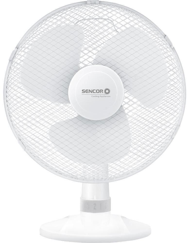 Ventilátor – stolný, vrtuľový, nastaviteľný uhol sklonu, ochrana proti prehriatiu, hlučnosť 50 dB, napájací kábel súčasťou balenia, rozmery 35 × 22,5 × 46,4 cm (Š×H×V), priemer lopatiek 30 cm, príkon 40 W, 3 rýchlosti, horizontálna oscilácia 90°, mechanické ovládanie, biela farba, hmotnosť 1,7 kg VentilátorSFE 3027WH-EUE3Pomocník pre dokonale čistý domovVentilátor Sencor SFE 3027WH-EUE3 spoľahlivo osvieži a zbaví vás nepríjemných pocitov, ktoré sú spojené s horúčavou. Má lopatky dlhé 30 cm a v